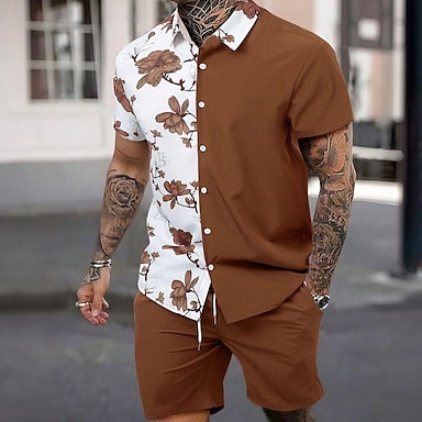 Hombre Plantas 2 piezas Conjuntos de camisas Tops de verano Manga Corta Cuello Vuelto Vacaciones Casual Exterior Hogar Casual Impresión 3D Rojo rubí Rojo Marrón