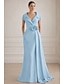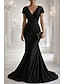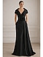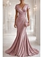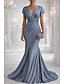 Corte Trompeta Sirena Hasta el Suelo Vestidos de noche Elegante Manga Corta Escote en Pico Boda Formal Satén elástico Espalda desnuda con Plisado