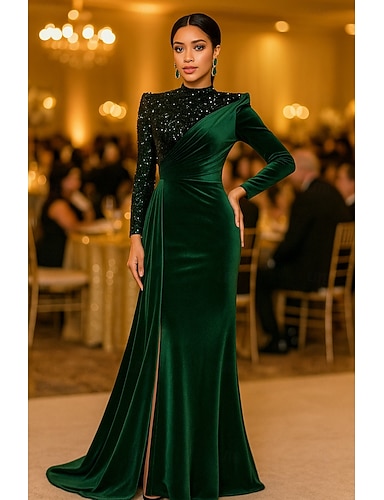 Funda / Columna Hasta el Suelo Trajes de gala Vestidos de noche Corte Cenicienta Vestimenta formal Elegante Manga Larga Cuello vuelto holgado Formal Boda Terciopelo con Pedrería 2025