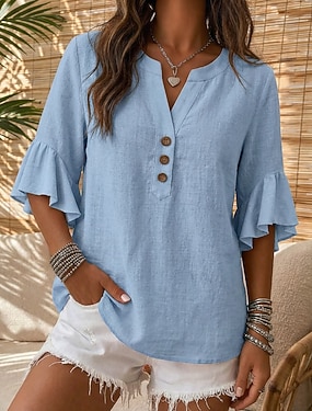 Mujer Blusa Remera de algodón Volante Botones Color sólido Plano Diario Elegante Básico Manga 3/4 Escote en Pico Tops largos Casual Diario Azul Piscina Negro Blanco Amarillo Rosa Verano Primavera