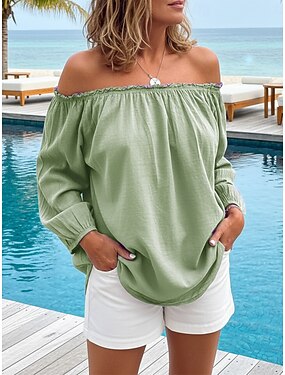 Mujer Camisa Blusa Plano Bohemia Elegante Casual Manga Larga Hombros Caídos Tops regulares Diario Festivos Noche Azul Piscina Amarillo Rosa Verde Ejército Morado Verano Primavera