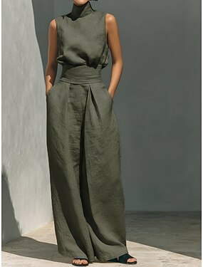 Conjuntos de pantalones de lino y algodón sintético para mujer, sin mangas, cuello alto, color liso, moda urbana, informal, para uso diario, para exteriores, negro, rosa, verde militar, verano, corte