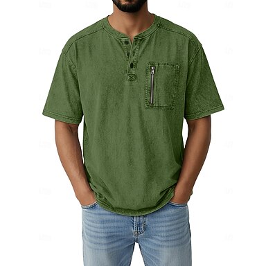 Hombre Camiseta Henley Shirt Camisa 100% algodón con lavado ácido Camiseta superior Manga Corta Plano Vintage Ropa de calle Casual Prenda teñida Desteñido Bolsillo con cremallera Henley Casual Hogar