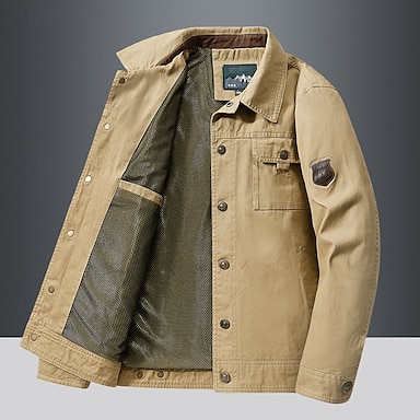 Chaqueta Detroit de algodón para hombre, estilo cargo, con bolsillo táctico, color liso, estilo vintage, cuello camisero, regular, color negro, marrón y caqui.