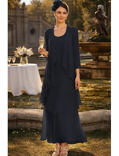Dos Piezas Corte A Traje de vestir Hasta el Tobillo Vestido Invitada Boda Vestido de Madrina Manga Larga Cuello Barco Elegante Formal Invitado a la boda Iglesia Gasa Vestidos de chaqueta con Encaje