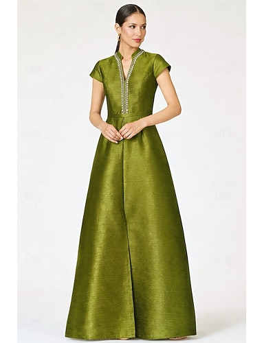 Corte A Hasta el Suelo Vestidos de noche Corte Cenicienta Vestimenta formal Elegante Manga Corta Escote en Pico Invitado a la boda Bolsillo Satén con Pedrería