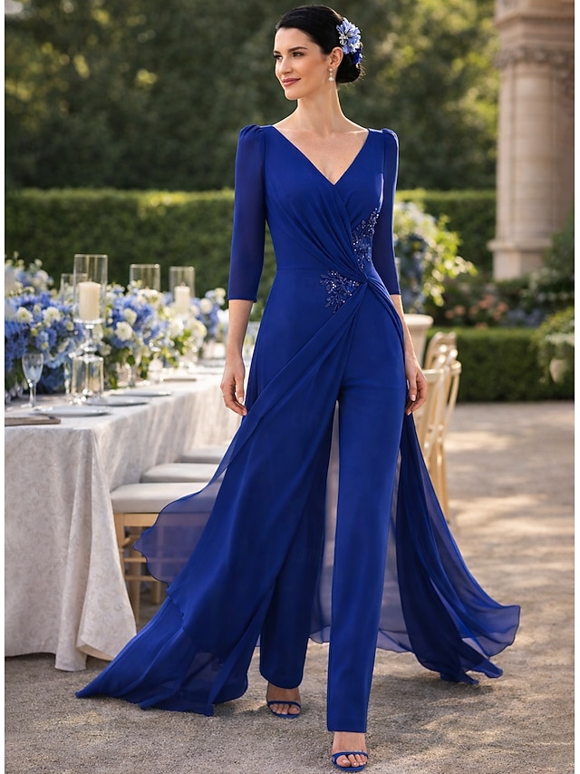 Traje de pantalón Hasta el Suelo Vestido de Madrina Manga 3/4 Escote en Pico Escote recto Elegante Vintage Formal Invitado a la boda Gasa con Fruncido Volantes en Cascada