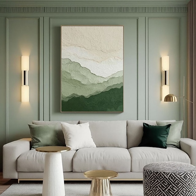 Regalo de Navidad: pinturas abstractas hechas a mano en tonos verde y beige, pintura de montaña, pinturas de paisaje verde, arte mural, gran panorama minimalista de valle, pintura al óleo #10573570