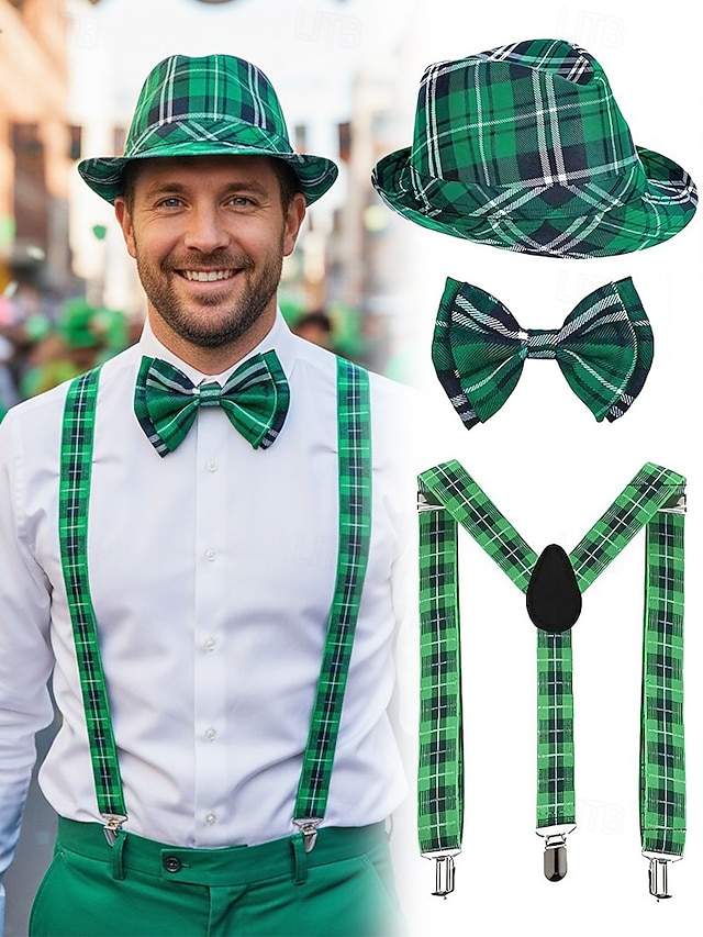 Conjunto de accesorios para disfraz de San Patricio para hombre: sombrero, pajarita y tirantes a cuadros verdes, poliéster con múltiples estampados, ideal para desfiles y fiestas irlandesas.#11665499