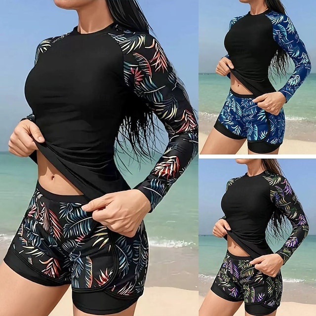 traje de baño de dos piezas para mujer tankini de palmera alta cintura control de abdomen alta cintura sin espalda vacaciones ropa de playa hojas florales cuello redondo de manga larga #14968893