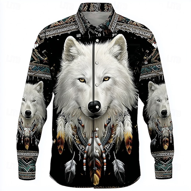 Hombre Lobo Atrapasueños Étnico Camisa Abotonar la camisa Manga Larga retro de la vendimia Exterior Acampada y Senderismo Caza Primavera Otoño Cuello Vuelto Impresión 3D camisas con cuello Negro 1 #17037045