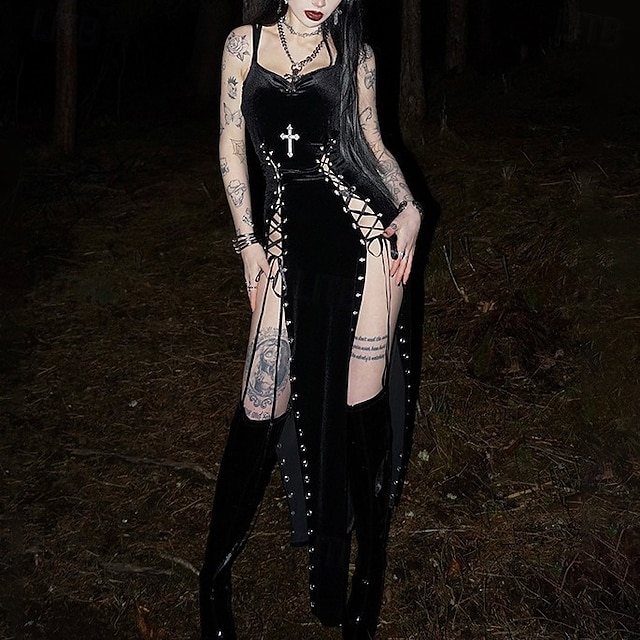 Gótico Maxi Vestidos Sin Mangas Bruja Vampiros Acordonado Terciopelo correa de espagueti Cruz Disfraz Mujer Fantasía Víspera de Todos los Santos Carnaval Rendimiento Fiesta Adultos Vestido#18807750