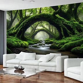 Tapiz de ventana de bosque, paisaje de montaña y río, fondo de pared, mural de pino natural para sala de estar, dormitorio, oficina, decoración verde