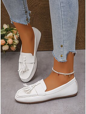 Mocasines de mujer blancos con borlas – Zapatos de cuero sintético suaves sin cordones para trabajo uso de fin de semana viajes y looks inteligentes-casuales