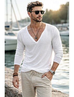 Hombre Henley Shirt Camiseta de lino Manga Larga Escote en Pico Verano Primavera Color sólido Vintage Bohemio Casual Puro Casual Vacaciones Calle Negro Blanco Verde Claro Camiseta superior para hombre