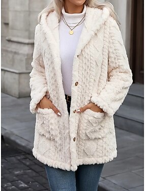 Mujer Chaqueta de sherpa Cómodo Transpirable Jacquard Botones Elegante Casual Plano Vacaciones Calle Casual Ropa Cotidiana Botonadura Simple Largo Con Capucha Ajuste regular Manga Larga Ropa de calle