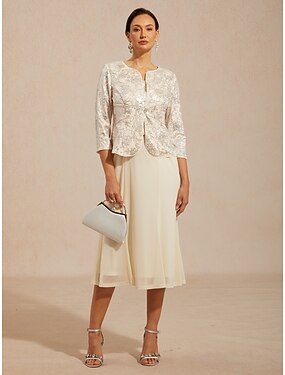 Conjuntos de vestido para mujer, blazer, chaqueta, cómodo, bordado con lentejuelas, elegante, floral, formal, abotonado, cuello redondo regular, corte regular, manga 3/4, ropa de abrigo, beige,