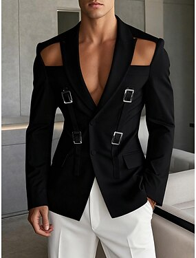 Blazer con hebilla de metal ahuecada para hombre, chaqueta con cuello cerrado, para fiesta, espectáculo, traje, color liso, negro, blanco y rosa, corte entallado, botonadura sencilla, dos botones.