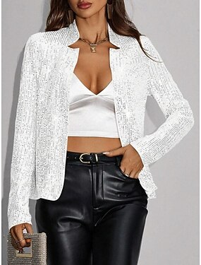 Mujer chaqueta Chaqueta casual Cómodo Retazos Lentejuela Moda Casual Color sólido Casual Fiesta Ropa Cotidiana Noche Corto Escote Chino Ajuste regular Manga Larga Ropa de calle Negro Blanco Champaña
