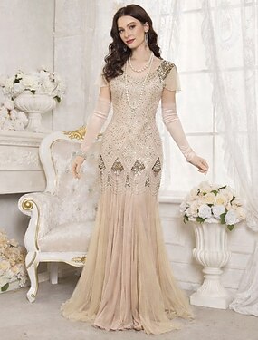 Rugido 20s 1920s Hasta el Suelo Hasta la Rodilla Vestidos Vestido de noche Accesorios Mangas cortas El gran Gatsby charlestón Invitado a la boda Lentejuelas Borlas Pluma Escote en Pico Disfraz Mujer