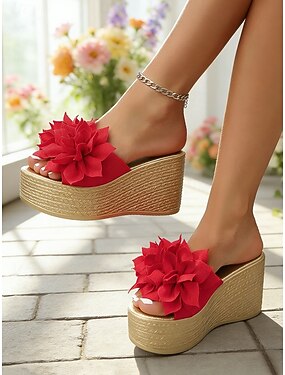 Sandalias de cuña verdes para mujer: elegantes sandalias con adorno floral y cuña de alpargata sintética para salidas informales, vacaciones de verano y fiestas en la playa.