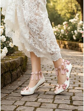 Zapatos planos florales de color marfil para mujer con detalle de encaje en el tobillo, zapatos de novia románticos para una boda al aire libre en un jardín.