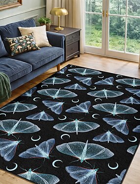 Alfombra con diseño de polilla blanca y luna creciente sobre fondo negro, elegante y cómoda para la decoración del dormitorio y la sala de estar, de Episodic Drawing.