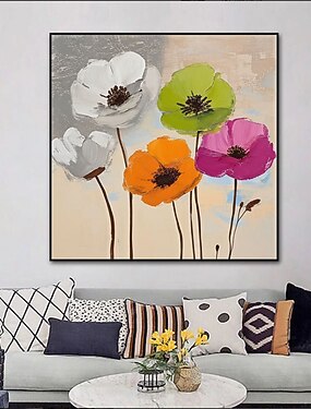 Arte mural floral grande, diseño abstracto hecho a mano, amapolas vibrantes en beige, flores sutiles, decoración floral, lienzo tradicional en beige.