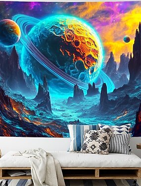 Planeta espacial de ciencia ficción, planeta brillante con anillos azules, paisaje volcánico, montaña, nebulosa, galaxia, tapiz de pared, dormitorio, sala de estar, dormitorio, sala de juegos, fondo