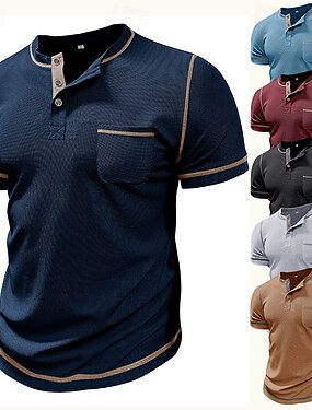 Hombre Camiseta de gofre Camisa henley gofrada Manga Corta Color sólido Vintage Abotonar Bolsillo Costuras en contraste Henley Casual Diario Verano Primavera Negro Gris Azul Claro Camiseta Henley