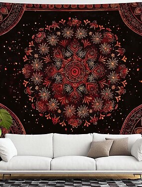 Tapiz de pared de mandala bohemio rojo oscuro granate con intrincado medallón floral para colgar en la pared, arte étnico bohemio de noche estrellada, decoración del hogar, fondo para sala de estar y
