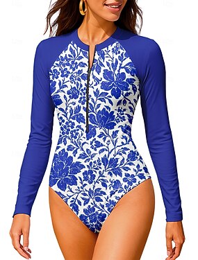 Mujer Estándar Camiseta Protección Solar Surf Traje de baño de cuerpo entero Traje de buceo Flores Cremallera delantera UPF50+ Secado rápido Alta elasticidad Manga Larga Bañadores Surf Canoísmo Buceo