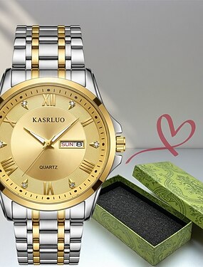 Reloj de lujo para hombre, reloj de pulsera de cuarzo de acero inoxidable bicolor con fecha y día, reloj analógico con números romanos y caja de regalo, elegante reloj resistente al agua para hombre,