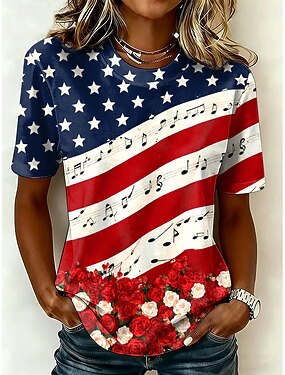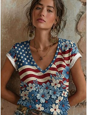 día de la independencia americana Mujer Camiseta Estampado Graphic Letra Bandera estadounidense Elegante Clásico Casual Manga Corta Escote en Pico Tops regulares Casual Diario Azul Piscina Verano