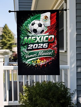 Bandera de jardín con temática de fútbol de México 2026, con los colores de la bandera mexicana y el lema "¡Vamos México!", perfecta para mostrar orgullo nacional. &decoración de exteriores
