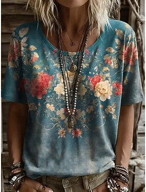 Mujer Camiseta Estampado Floral Graphic Geométrico Vintage Elegante Casual Manga Corta Cuello Barco Escote Redondo Tops regulares Casual Diario Azul Piscina Rosa Verde Trébol Verano Primavera