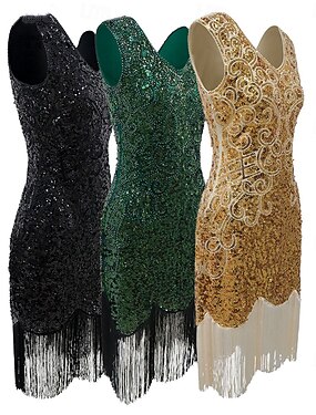 Rugido 20s 1920s Hasta la Rodilla Vestido Flapper Sin Mangas El gran Gatsby Lentejuelas Franja Escote en Pico Disfraz Mujer Navidad Carnaval bar clandestino Mascarada Fiesta temática retro Adultos