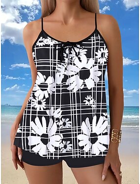 Tankini de 2 piezas para mujer pantalones cortos control de abdomen talle alto espalda descubierta vacaciones ropa de playa floral cuello en U sin mangas