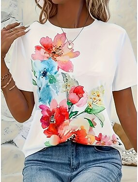 Mujer Camiseta Bloque de Color Estampado Floral Graphic Vintage Elegante Clásico Manga Corta Cuello Barco Tops regulares Diario Azul Piscina Rojo Morado Verde Trébol Verano Primavera