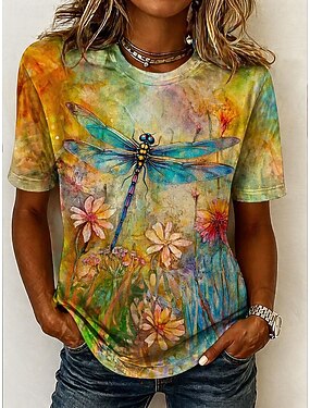 Mujer Camiseta Estampado Floral Graphic Libélula Vintage Moda Elegante Manga Corta Cuello Barco Tops regulares Casual Diario Fin de semana Azul Piscina Amarillo Morado Verano Primavera