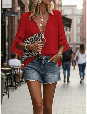 Mujer Blusa Encaje Ojal Botones Color sólido Elegante Básico Casual Manga Corta Escote en Pico Tops regulares Diario Azul Piscina Negro Blanco Verde Claro Rosa Verano Primavera