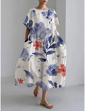 Mujer Vestido Midi Vestido informal Moda Básico Moderno Diario Exterior Playa Holgado Floral Manga Corta Cuello Barco Azul Piscina Azul Oscuro Verano Primavera