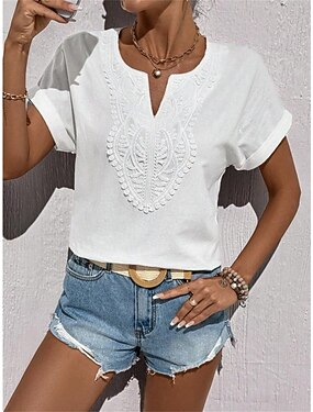 Mujer Tops de verano Blusa Tops de encaje Frunce Encaje Retazos Color sólido Plano Elegante Vintage damas Manga Corta Manga Murciélago Escote en Pico Tops regulares Diario Trabajo Festivos Blanco