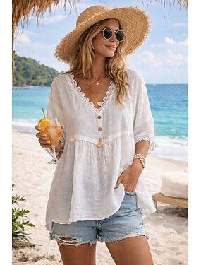 Mujer Blusa Remera de algodón Encaje Retazos Color sólido Diario Elegante Básico Manga 3/4 Escote en Pico Tops regulares Diario Azul Piscina Blanco Verde Trébol Caqui Verano Primavera Otoño