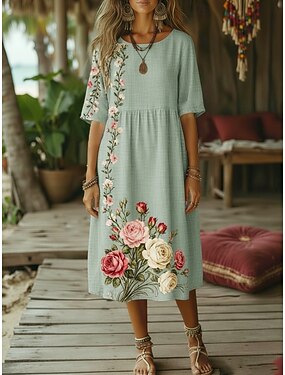 Mujer Vestido Midi Lino de algodón sintético Vestido bohemio Vestido de cambio Vestido informal Vintage Diario Exterior Playa Holgado Floral Media Manga Cuello Barco Azul Piscina Rosa Naranja Verde