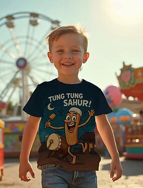 Personaje de batería juguetón con gráficos 3D para niños &Camiseta con estampado de Tung Tung Sahur, manga corta, para verano y primavera, básica, para niños de 4 a 12 años, cuello redondo, informal,