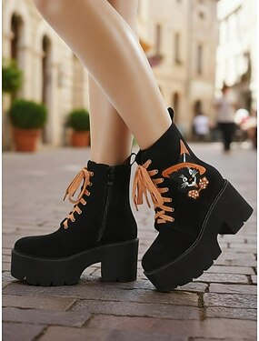 Botas de Halloween con plataforma y cordones para mujer con bordado de gato: botines de ante negro con tacón grueso para festivales de otoño, ropa urbana y fiestas de disfraces.