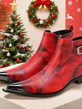 Botas clásicas rojas de piel con cremallera para hombre: elegante acabado charol con un diseño estilizado, ideales para las celebraciones de Navidad y Año Nuevo.