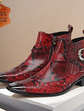 Botines rojos de hombre con estampado de serpiente – piel de primera calidad con detalles de tachuelas, perfectos para fiestas navideñas y reuniones festivas.