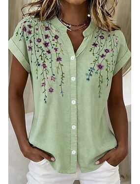 Mujer Camisa Blusa Bordado Floral Elegante Casual Manga Corta Cuello con muescas. Tops regulares Diario Verde Ejército Azul Marino Verano